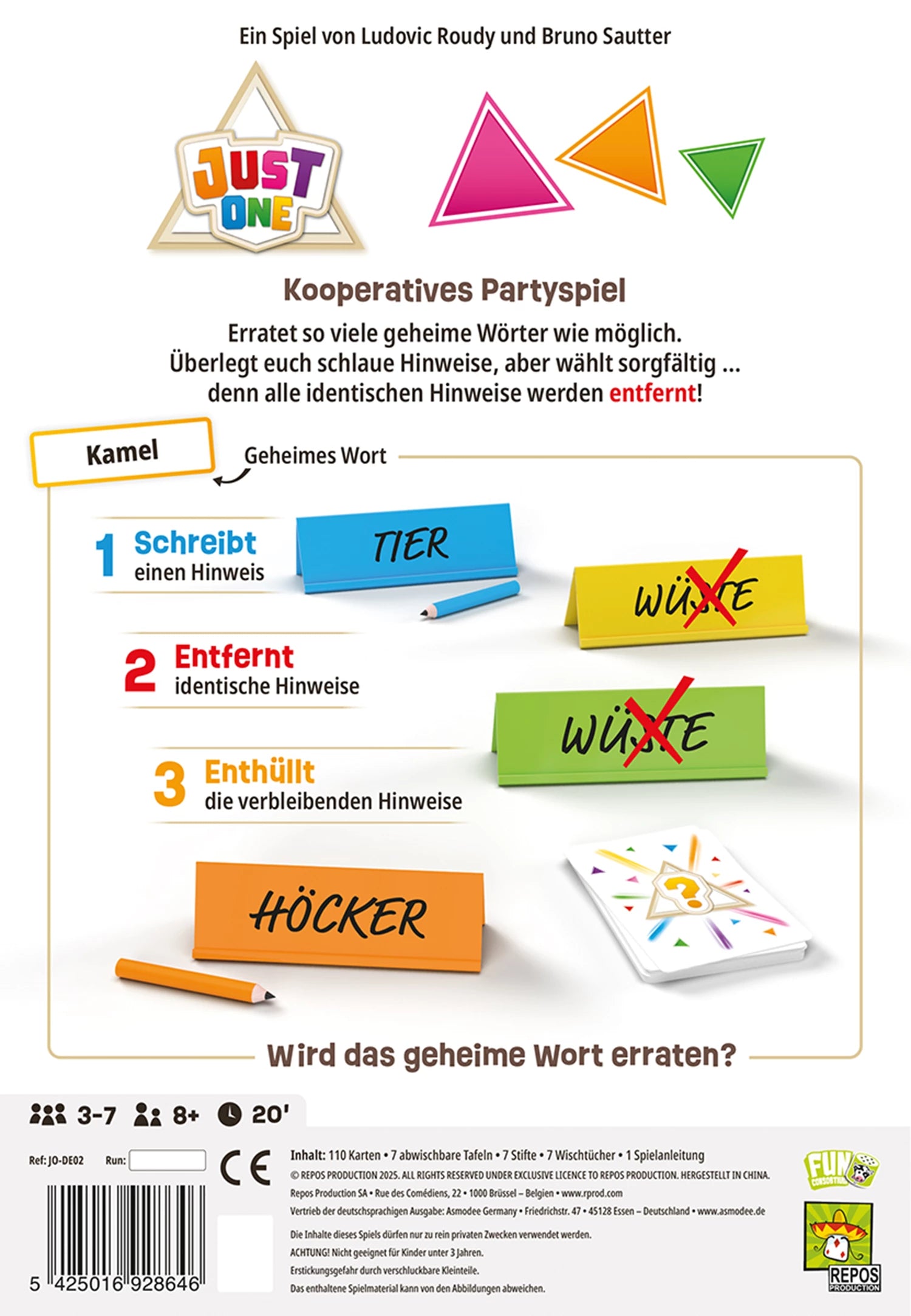 Just One ist ein kooperatives Party Spiel bei welchem die Spieler gemeinsam für die meisten Punkte kämpfen. In jeder Runde muss ein Spieler ein geheimes Wort erraten. Dazu schreiben die Spieler jeweils ein Hinweiswort auf Ihre abwischbaren Tafeln. Hier ist Kreativität und Intuition gefragt, denn wird ein Hinweis mehr als einmal aufgeschrieben wird er verdeckt und steht dem ratenden Spieler nicht zur Verfügung.